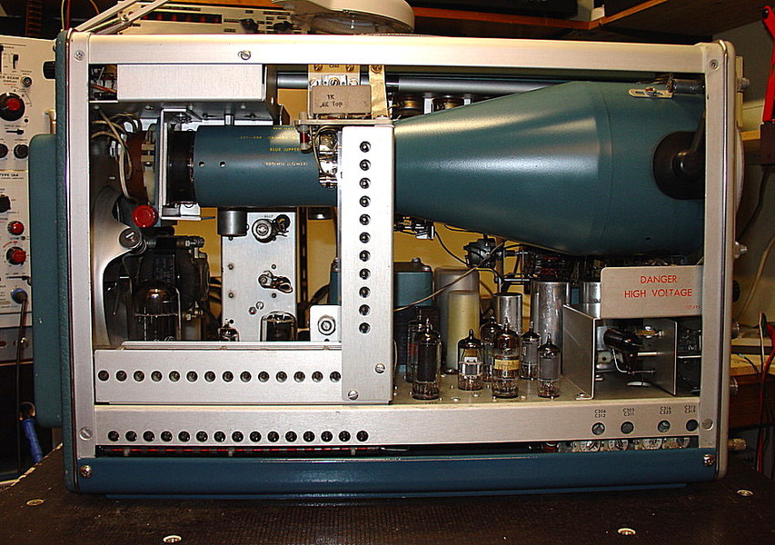 Die sehr helle Bildröhre hat ein beleuchtbares Außenraster, so dass die Photos der Oszillogramme Parallaxenfehler enthalten.