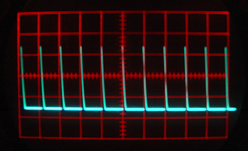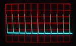 Bild 6 zeigt das 2V-Signal des Eichgenerators bei 0,5 V/cm (Parallaxefehler!).