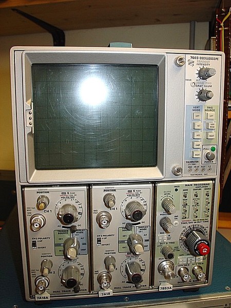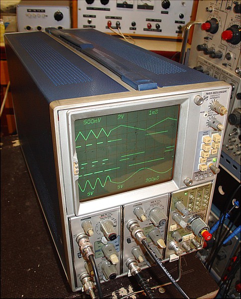 Bild 8 zeigt ein Gerät mit neuer Lackierung in einem tieferen Blau als das Tektronix-Blau.